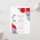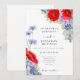 Lindos e elegantes convites de casamento com aquarelas botânicas pintadas à mão de flores silvestres de verão em tons de azul cornflower, roxo, rosa, vermelho, verde e amarelo. Flores incluindo cosmos, centáureas, margaridas, papoulas e não-me-esqueças com folhagem. Modelo fácil de usar com tipografia moderna e elegante. Perfeito para um casamento de verão ou primavera com tema floral botânico azul roxo único. Arte original e exclusiva da artista Catherine Sweetman.