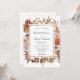 Um belo convite para o casamento em cor de outono e outono. O convite é enquadrado com um buquê colorido de flores em terracota, rajadas, pintas moles, branco e castanho. Todos os campos podem ser editados.