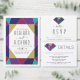 Convite de casamento moderno geométrico abstrato jóia pedra preciosa. Este convite de casamento contemporâneo moderno apresenta triângulos em rosa claro, verde menta, amarelo claro, cor-de-rosa e dourado. Os triângulos têm contornos impressos FALSO que parecem brilhar ou folha de ouro e formam uma jóia abstrata.