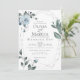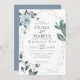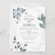 Convite para WEDDING | rosas de aquarelas, folhas e bagas do moderno rolo azul poeirento, ao estilo geométrico do terrário Moldura prateada com verde-salva. O reverso é um azul empoeirado complementar. Personalizar texto, estilo de fonte, cor e tamanho. Arte original criada para o BarefootBride™ por © WhimsicalArtwork™ - Esta é parte de um Conjunto completo de Artes de Casamento, chá de fraldas e outros artigos de papelaria para eventos semelhantes.