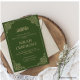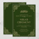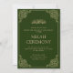 Convocação para Casamento Islâmico Islâmico da Cerimônia de Nikah. Plano de fundo verde escuro sólido com uma fonte dourada na frente da placa. Há um design barroco vintage de luxo no canto da fronteira. Você também pode personalizar os nomes, a data do evento de casamento e as informações do local. Você pode adicionar texto à placa traseira, se necessário. O delaLineForDesign no Zazzle.
