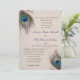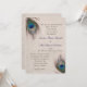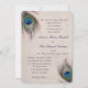 Lindas penas azuis, bronzeadas e pavões verdes rodopiam pelos cantos superior esquerdo e inferior direito deste elegante convite para o casamento. Seu texto personalizado está em azul escuro e marrom no centro. As imagens e o texto são colocados sobre uma cinza de luz angustiada e sobre um fundo que complementa as cores das penas. O verso do convite tem um fundo de correspondência, mas sem as penas. Distintivo e requintado!