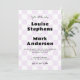 Um padrão de tabuleiro lilás pálido é um fundo gráfico doce e retrô para um convite de casamento de casais modernos, definindo o tom para um caso casual e divertido. Edite facilmente o texto, altere fontes e cores usando os recursos avançados de edição para realmente fazer deste convite um tipo e reflexivo daquele casal não tradicional. Texto adicional na parte traseira e um código de QR fácil de editar oferecem aos seus convidados uma maneira rápida e fácil de aprender tudo sobre seu casamento e eventos associados, além de uma maneira mais amigável de enviar seu RSVP.