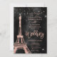 Um convite de casamento moderno, chico e glamouroso com um francês desenhado a ouro-rosa, francês, chamado à mão, chamado de Paris Eiffel Tower com brilho rosa de diamante brilhante em um fundo de aquarela preto.