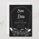 Aceite o encantamento com este Casamento Gótico Salve o Convite de Data, perfeito para um casamento de Halloween. Esta design moderna e elegante combina uma estética boho-escura com uma vibração mórbida e assustadora, capturando a essência de uma celebração de outubro. Intrajado com teias de morcegos e aranhas, ao lado de delicados elementos florais, esse convite apresenta uma paleta de cores preto-e-branco impressionante. Ponha o tom para o seu dia especial com uma combinação única de assombração da beleza e da elegância do eterno.