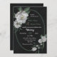 Convite de casamento único com flores brancas românticas e folhas verdes em uma bela estrutura geométrica oval em fundo preto. PARA MAIS PRODUTOS CORRESPONDENTES, clique na coleção acima ou entre em contato comigo.
