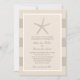 O convite para o casamento "Shoreline Chic" num formato de retrato 5 x 7 apresenta faixas de cabana de na moda, uma ilustração de estrela e bege neutro, areia e esquema de cores escura. Estilo simples e elegante, perfeito para um destino de casamento à beira-mar.