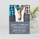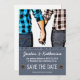 Perfeito para o homem e a mulher do campo, sulistas ou agricultores, este convite de anúncio de casamento futuro "save the date" em preto e branco com xadrez vermelho e azul apresenta uma imagem fotográfica posterizada de um casal country afetuoso e amoroso de mãos dadas. Ambos estão vestidos casualmente, talvez com roupas de trabalho, jeans azuis e camisas xadrez. Texto branco em negrito e dramático sobre um fundo com padrão de jeans azul com costuras e rebites. Personalize o convite com a data e detalhes do seu casamento. A imagem fotográfica original era de domínio público, de kozzi.com. Acessórios de jeans de DigitalScrapbooking.net