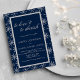 Clássica caligrafia elegante de script chic prata com convites para casamentos no inverno de flocos de neve marinho azul e prateada. Este maravilhoso tema do inverno é perfeito para a moda e o casal. Personalize este design com sua mensagem e informações personalizadas. Todas as designs são impressas.