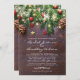 Convites de casamentos no inverno russos com fundo de madeira escuro, ramos festivos de árvores de natal, decorações de árvores vermelhas e douradas e luzes de cinzas de cordas.