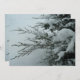 Um convite de casamento no inverno com uma foto na frente e atrás de um galho de árvore verde revestido de neve. A redação é dos pais da noiva.