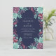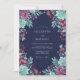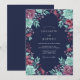 Este design dramático apresenta um fundo azul naval profundo adornado com uma bordadura exuberante de flores em aquarela. Rosas e peônias delicadas em tons de azul-turquesa, aqua e ameixa criam um contraste marcante contra o fundo escuro. Verdura rica e acentos folhosos adicionam um toque orgânico e pictórico a esta estética noturna elegante. Perfeito para um evento sofisticado de inverno ou meia-noite.