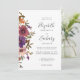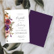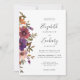 A borda esquerda deste convite romântico de casamento apresenta um buquê floral de cor d'água de flores roxas, roxas, pincéis e cobre e verde. O texto personalizável combina manuscrito, copperplate e fontes itálicas em cinzas de carvão em um fundo branco. O reverso é um roxo sólido coordenado. Ideal para um casamento outono!