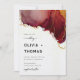 Um modelo de convite para casamento outono que apresenta uma cena de aquarela pintada e abstrato com efeito de derrame de tinta dourada (o ouro é um efeito digital, não uma folha real!) em burgundy e laranja, e caligrafia moderna. Clássico e elegante, simples e moderno, é uma escolha encantadora para um casamento na praia de outono - ou simplesmente um casamento de outono para um casal que ama cores de queda e design moderno.