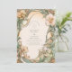 Uma design de casamento romântica Art Nouveau, com cor de pêssego e flores de creme fluentes, entrelaçados com roldanas botânicas verdes e suaves. Esta elegante ilustração rodeia um layout antigo com curvas graciosas e detalhes de ornamentado, perfeito para casais que buscam uma estética de casamento clássica, mas artística, inspirada pela natureza e beleza antiga.