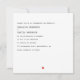 Crie convites de casamento limpos e minimalistas com sua foto. Estes convites em forma quadrada estão prontos para serem personalizados com a sua fotografia. A frente mostra sua fotografia com seus nomes e a data do casamento acentuados por um gráfico de coração vermelho. O verso tem um estilo sobressalente e minimalista com uma fonte de máquina de escrever preta e sem formatação sobre o fundo branco. Há muito espaço para adicionar todos os seus detalhes de casamento. Um gráfico cardíaco vermelho comum aparece no fundo.