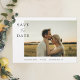 Este simples e na moda, casamento fotográfico moderno, salva a data da modelo de placa simples 'SAVE the DATE' na frente, veiculada com uma combinação impressionante de duas fontes distintas, com 'the' em um guião luminoso e fluente entre o resto da mensagem, que é, em cima, com uma aparência formal ousada e firme. O texto em ambos os lados é preto por padrão. Você pode alterar o texto de detalhes na parte frontal e qualquer texto na parte traseira para se adequar ao seu estilo - você pode escolher alterar a cor, a fonte ou o tamanho deste texto. Na frente, definimos o plano de fundo como transparente para permitir que a cor do papel sirva simplesmente como tom base. Na parte de trás, escolhemos uma cor de fundo chamada Fumaça Branca, é uma cinza muito clara que é principalmente branca. Você também pode mudar isso se quiser. No verso, escolhemos uma ordem atípica para a informação, colocando o texto 'por favor, salve a data' depois do texto 'para o casamento de', que lhe dá um charme menos viajado. Você pode alterar facilmente esta ordem ou alterar a capitalização, excluir ou alterar vários campos de texto para mostrar uma redação totalmente diferente, etc., ao editar o cartão para mostrar seus próprios detalhes. Use as ferramentas intuitivas de edição e design, sua foto favorita e sua inspiração para fazer com que este casamento de fotos simples salve o cartão de data exclusivamente seu!