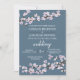 Um elegante convite de casamento com galhos de flores de cereja rosa e branca pintadas à mão em um fundo azul cinza acentuado com a caligrafia moderna. Design e ilustrações originais por Impressões de pino de Gatinho.
