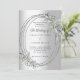 Um fundo de olhar mal prateado. Uma moldura de prata oval decorada com verde-sábio. Personalize e adicione seus nomes, detalhes. Texto preto.