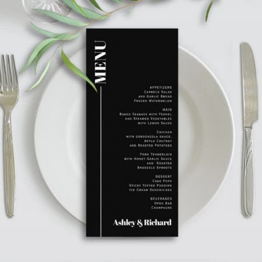 Este convite para o casamento é um exemplo espantoso de design moderna e minimalista. O esquema de cores negras sofistica, enquanto a tipografia quística branca adiciona um toque de elegância. O layout espaçoso melhora a estética geral, criando uma aparência limpa e na moda. Uma linha vertical branca no lado esquerdo do convite adiciona intrigas visuais contra o fundo preto. Os nomes dos casais são inteligentemente incorporados, se estendendo para cima, dando um toque personalizado ao design. Com o mínimo de texto, o convite foca a palavra branca e negrito 'WEDDING' e os detalhes essenciais, garantindo fácil legibilidade e compreensão. Para tornar o RSVP sem complicações, a parte traseira do convite apresenta um código QR para resposta on-line.