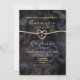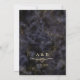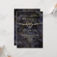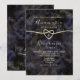 Convite de casamento preto e dourado com brilho de mármore geodo abstrato moderno e luxuoso, boho elegante, com monograma no verso, caligrafia moderna e corda dourada em forma de coração.