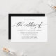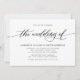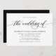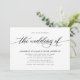 Simples, clássico convite de casamento elegante apresenta um roteiro de tipografia em letra manuscrita ''o casamento de'' e detalhes em letras maiúsculas em negrito em fundo branco.