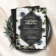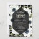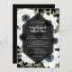 Flores elegantes de anêmona preto e branco e folhas de aquarela em fundo preto apresentam detalhes da cerimônia de núpcias em letras brancas em uma entrada transparente de diamante preto. Mude o fundo da base preta para qualquer cor para corresponder ao seu tema de casamento. COORDENANDO itens disponíveis em nossa loja para completar seu pacote de convites —> http://bit.ly/2WEA0w5 <—