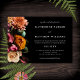Este elegante design de convite para o casamento apresenta florais de outono maravilhosos num fundo negro com tipografia clássica. Esta design é a escolha perfeita para um casamento rústico mas elegante no final do verão ou no outono.