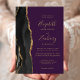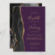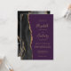 A borda esquerda deste elegante convite de casamento moderno apresenta uma coloração aquosa preta, borda agitada, aparada com falso brilho dourado. O texto personalizável combina manuscrito dourado, fontes em copperplate e itálico em fundo roxo profundo. O verso apresenta um design de agate preto e dourado correspondente.