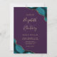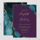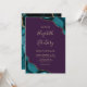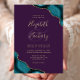 Uma cor azul-lacrimogênea agate design aparada com brilho de ouro falso aparece em dois cantos deste design elegante. Personalize-o com os nomes dos casais em um guião de escrita manual dourada sobre um grande e grande. Adicione os detalhes do casamento em uma placa colorida dourada e fontes itálicas em um fundo roxo. O verso apresenta um design de chaleira e de agata dourada.