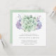 Convite de casamento quadrado botânico com um buquê de suculentos de aquarela verde e roxa e seus detalhes em uma fonte de cinza macia. A parte de trás tem uma lavagem com aquarela verde. Os suculentos adicionam um elemento natural excelente ao design. Estes convites são perfeitos para um casamento no deserto na primavera ou no verão.