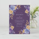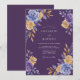 Uma rica tela roxa profunda apresenta rosas e peônias exuberantes em arranjo de canto vibrante em aquarela. Tons de pervinca e lavanda contrastam com flores amarelas douradas quentes e folhagens metálicas cintilantes. A estética sombria e temperamental cria um clima sofisticado e régio perfeito para um evento sazonal elegante.