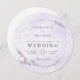 Convite de casamento redondo com flor de lavanda roxa de cor d'água, arranjada em uma coroa.
