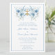 Personalize nossos lindos convites de casamento florais tradicionais católicos azuis com anéis de casamento dourados enrolando um crucifixo de ouro. Todo texto e fontes podem ser modificados.