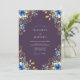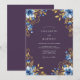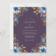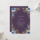 Evoque elegância com este design romântico apresentando vibrantes flores azuis e folhagens ricas em dourado. Detalhes florais delicados criam uma atmosfera caprichosa e encantadora, perfeita para uma ocasião memorável. O fundo roxo profundo realça o contraste marcante da arte.