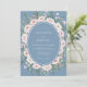 Um cenário sereno em azul desbotado apresenta delicadas flores cor-de-rosa entrelaçadas com folhagem exuberante. Este design evoca uma atmosfera romântica e encantadora, perfeita para uma celebração atemporal. A suave disposição floral adiciona um toque de elegância natural.
