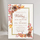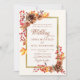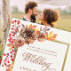 Um poho moderno, elegante outono, quadro floral de mães, pães e morangos vermelhos em aquarela e um esquema de cor de cobre e ferrugem enfeitiça este elegante, simples, elegante e moderno modelo de convite para casamento que também apresenta um quadro de ouro escovado (este é um efeito digital, não uma folha real). Apresenta caligrafia moderna e elegante. Luxuoso, mas simples, clássico, mas chique, moderno, mas eterno. Uma escolha encantadora para um casamento no outono com cobre, laranja queimada, terracota, bege, vermelho, laranja e outras matizes de outono.