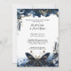 Este convite romântico de casamento apresenta um tema celeste em tons de azul e ouro marinho. As bordas superior e inferior apresentam uma cena noturna do céu com estrelas e uma lua crescente. Uma mariposa majestosa é fotografada no fundo, sotaques com ouro e flores azuis.