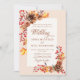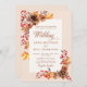 Um boho moderno, elegante outono, quadro floral de mães, pães e morangos vermelhos em aquarela e um esquema de cor de cobre e ferrugem enfeitiça este elegante, simples, elegante e moderno modelo de convite para casamento. Apresenta caligrafia moderna e elegante. Luxuoso, mas simples, clássico, mas chique, moderno, mas eterno. Uma escolha encantadora para um casamento no outono com cobre, laranja queimada, terracota, bege, vermelho, laranja e outras matizes de outono.
