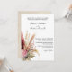 Este convite romântico de casamento apresenta um tema floral boêmico. Uma bela buquê de erva boho pampas é fotografada à esquerda. A imagem do estilo de aquarela apresenta flores secas, penas e caules em tons quentes de bege, marrom, pincel e rosa. As informações do casamento e a localização do local são impressas em uma fonte preta elegante ao lado da grama dos pampas.