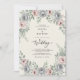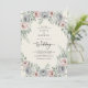 Este design apresenta uma paleta delicada de aquarela em azul suave e rosa beijo. Rosas elegantes e folhas de eucalipto dólar de prata criam um arranjo romântico. A estética evoca um clima sereno e etéreo, perfeito para um evento inspirado no vintage da primavera ou verão. A folhagem de sage verde suave adiciona um toque botânico atemporal ao layout artístico.