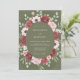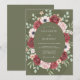 Um rico display de rosas vermelhas profundas e flores cor-de-rosa suaves envolve um oval central. Anêmonas delicadas e folhagem verde exuberante criam uma atmosfera romântica e encantadora. A paleta de cores evoca um sentimento atemporal e gracioso para uma ocasião especial.