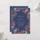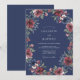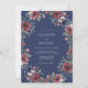 Um fundo azul-marinho profundo é adornado com uma rica bordadura em cascata de rosas vermelhas profundas, delicadas flores azuis e folhagem verde exuberante. Este design evoca um sentimento de romance clássico com sua elegante composição floral.