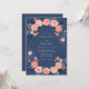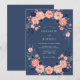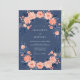 Este design apresenta um fundo azul-marinho profundo combinado com um arranjo vibrante de rosas pêssego e coral. A folhagem azul escura cria uma estética botânica sofisticada e sombria adequada para cerimônias de inverno ou formais. Detalhes suaves em aquarela e elementos florais em flor fornecem um visual romântico e atemporal. A paleta rica e os acentos florais evocam uma atmosfera de elegância.