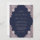 Estes elegantes convites para casamento rosa e marinho azul com rendas florais rosa de ouro num fundo azul marinho são perfeitos para convidar os seus convidados para a festa de casamento rustica azul e rosa de marinho.