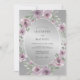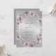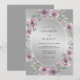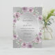 Este design apresenta um fundo metálico prateado brilhante que cria uma atmosfera sofisticada. Rosas delicadas em aquarela em tons de rosa malva empoeirado e lavanda são arranjadas elegantemente, complementadas por folhas de verde sálvia suave. A paleta de tons frios e roxos suaves evoca um clima romântico e gracioso adequado para um evento sofisticado.