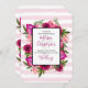 Um convite para o casamento com um bouquet floral composto por rosas de rosa claro e papoilas cor-de-rosa escuras com muitas folhas verdes e peludas. Um quadro de deco de arte retangular em camadas acima para colocar seu dentro de texto personalizado. O fundo é um padrão de listras rosa-macio.
