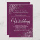 Este convite de casamento simples, mas elegante, contém a inscrição de cinzas em um fundo magenta ou roxo. O design é subestimado, mas os cantos apresentam um filigre floral de folha fina prateada ornamentado com cachos e fritos. O texto é formal e tradicional, mas a design de chic torna esse convite apropriado para qualquer casamento.