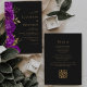Este romântico, humorístico, convite floral escuro mostra uma fronteira de flores roxas disparadas com folhagem de folha de papel dourada. Os nomes do casal aparecem em fontes clássicas de serifa dourada, com o texto restante em itálico, sobre fundo off-black. O verso fornece espaço para detalhes do casamento em um fundo escuro sólido, junto com um código QR que os convidados podem digitalizar para visitar seu site e RSVP, o que economiza o custo de imprimir e enviar cartões RSVP separados.