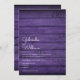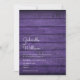 Simples convite de casamento rústico com os nomes de casais felizes em um roteiro elegante acima dos detalhes especiais de casamento em um fundo de madeira rústica. O reverso apresenta um fundo de madeira roxa russa correspondente. Projetado por Thisnotme©
